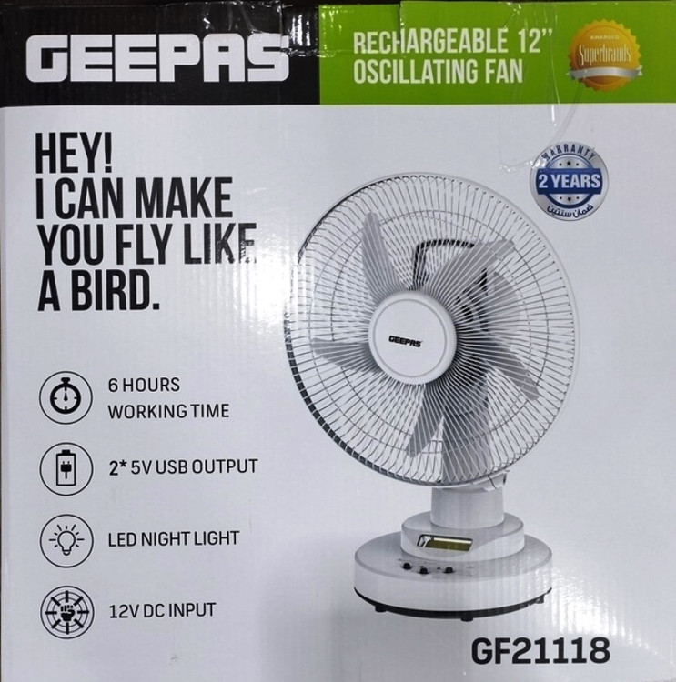 پنکه شارژی ۱۲ اینچی Geepas GF21118 | 6 ساعت کار بیوقفه با قابلیت نوسان 120 درجه و چراغ LED 24 ساعته! 🌬️