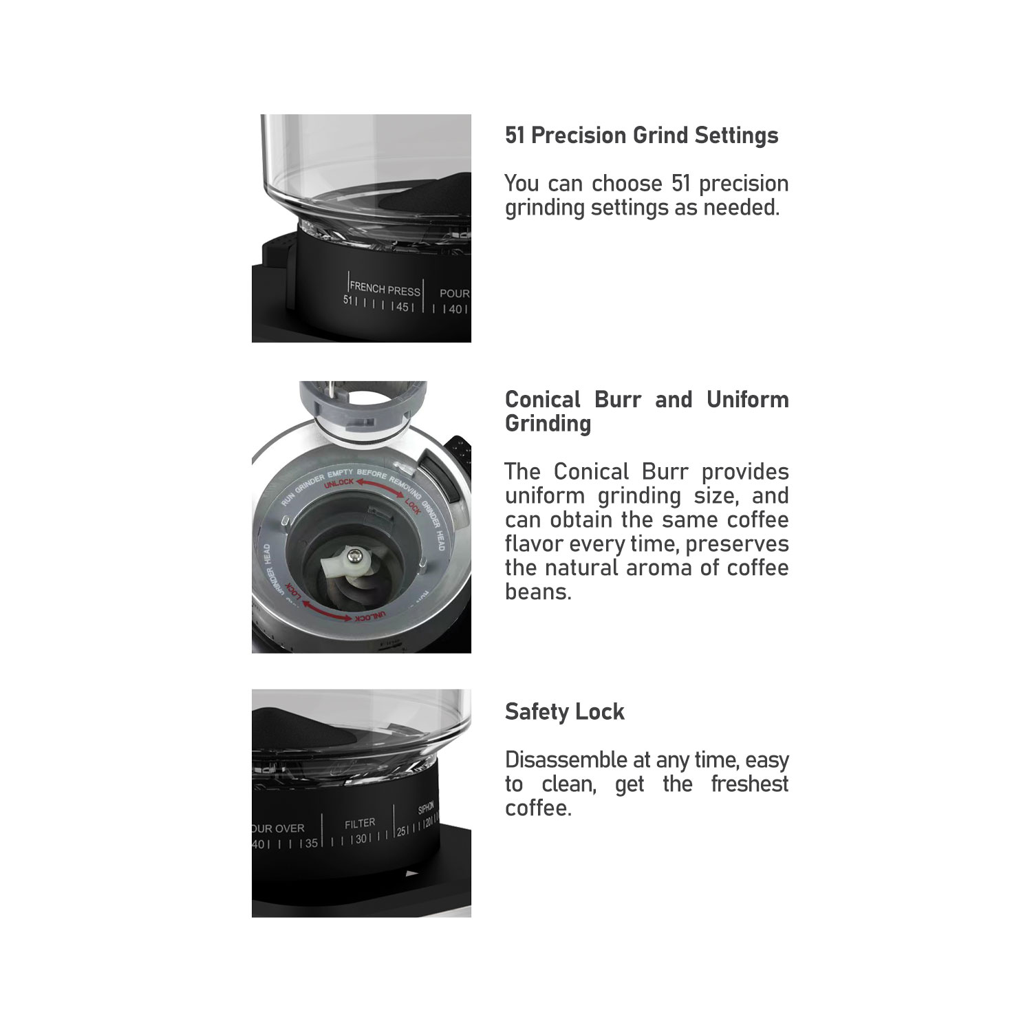 ۵۱ درجه تنظیم آسیاب، از پودر نرم اسپرسو تا دانه درشت فرنچ پرس را پوشش میدهد.