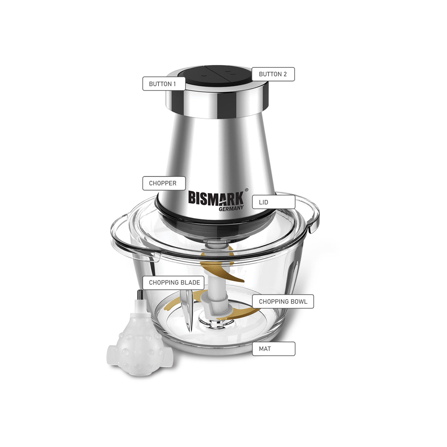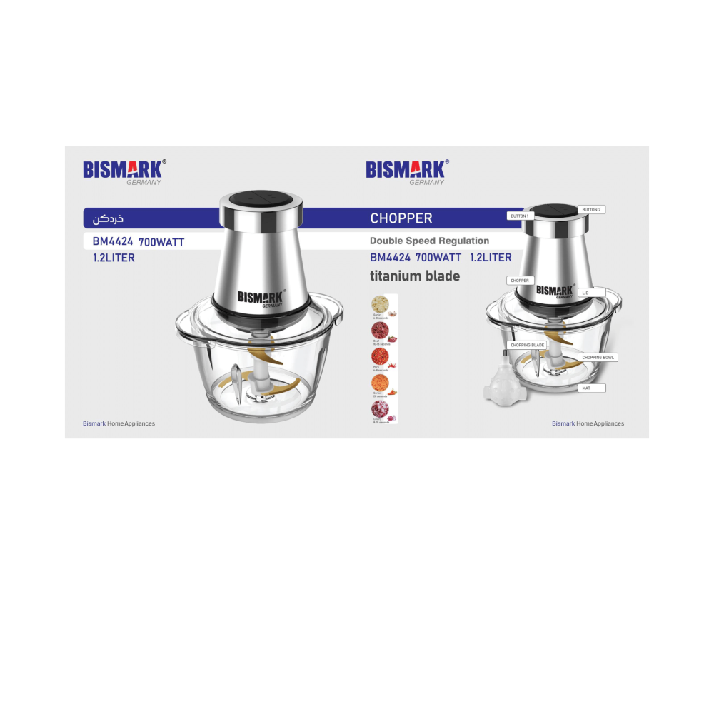 خردکن بیسمارک مدل BM4424 یک دستگاه برقی با توان 700 وات است که با بهرهگیری از تیغههای تیتانیومی ضد زنگ و ظرف پیرکس 1.2 لیتری، سبزیجات، مغزها و سایر مواد غذایی را در دو سرعت مختلف به شکلی یکدست و سریع خرد میکند.