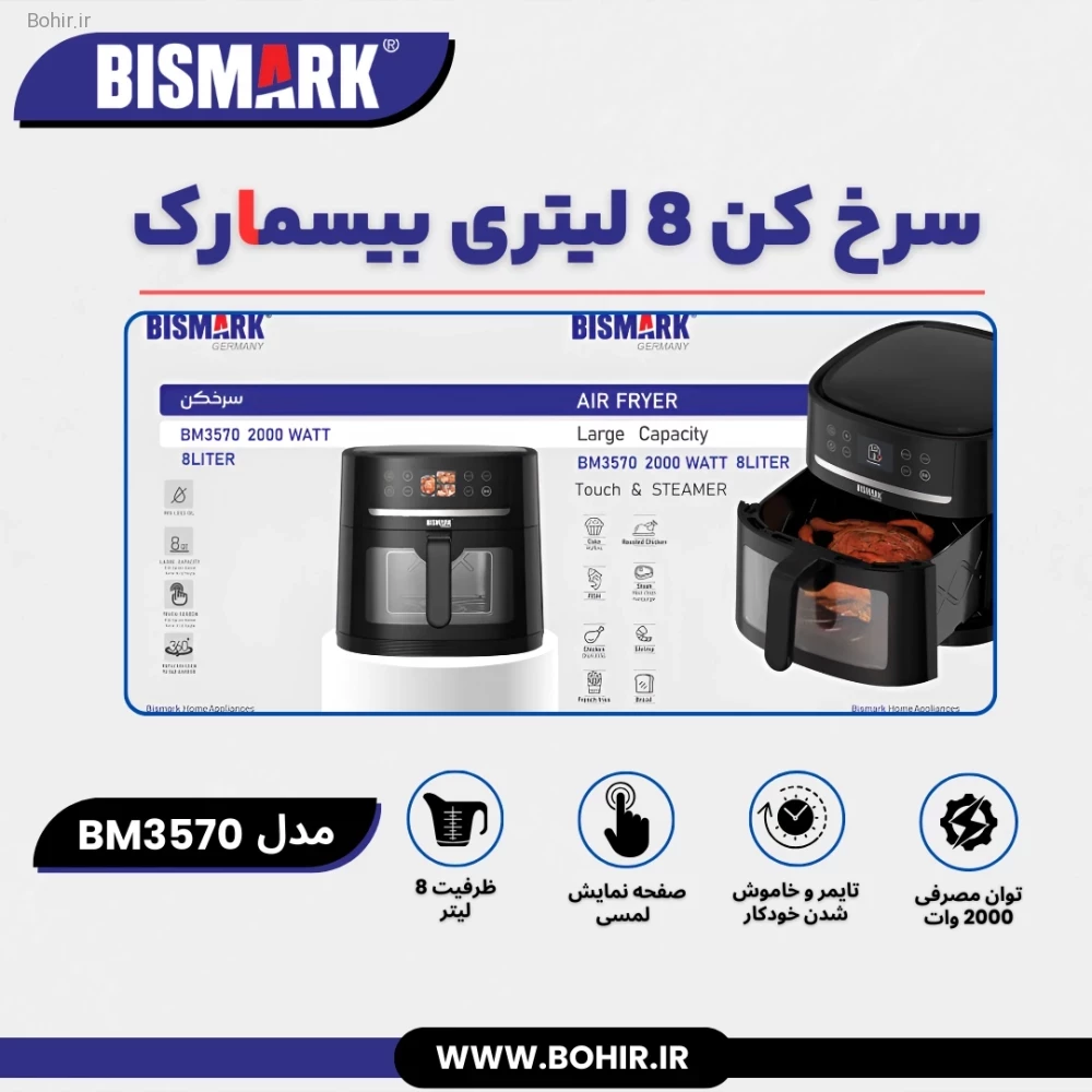 سرخ کن 8 لیتری بیسمارک مدل BM3570 یک هواپز بزرگ 2000 وات با صفحه لمسی و فناوری هوشمند مدیریت انرژی است که برای بیش از 10 نفر مناسب بوده و با ظرفیت بالا، تایمر دیجیتال، خاموشی خودکار و قابلیت گرم نگهدارنده، پخت سریع و ایمن را فراهم میکند.